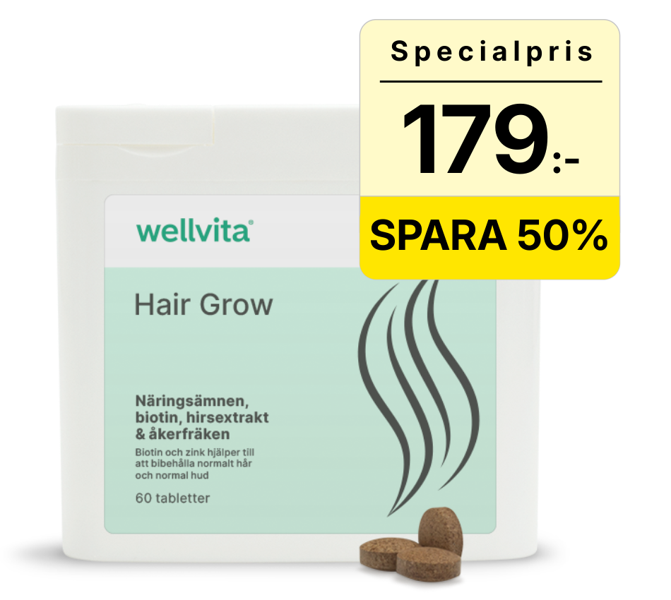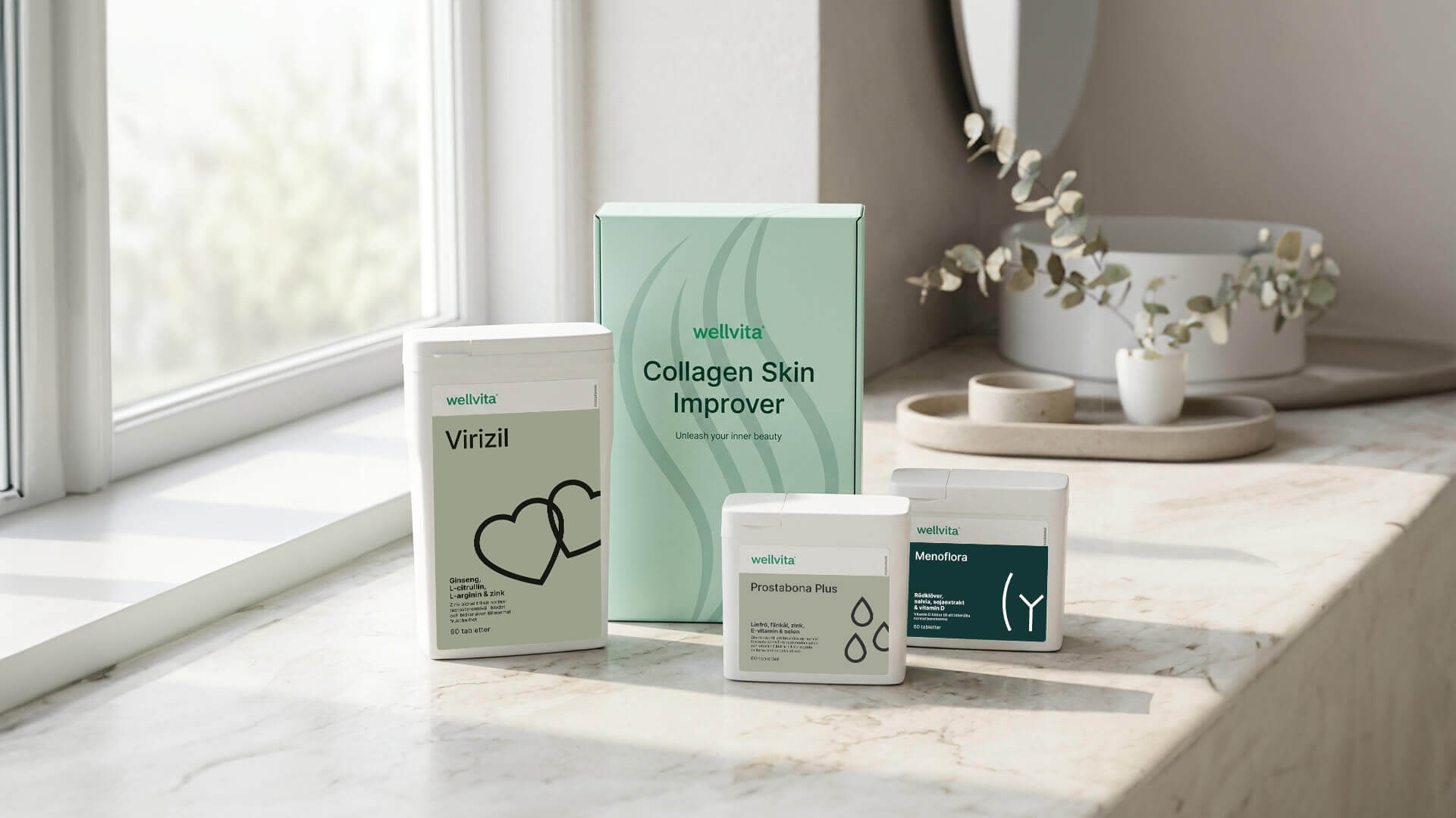 Vi vet att mitten av livet kan vara den bästa tiden – men också en tid då kroppen börjar göra sig påmind lite. Därför utvecklar vi produkter som hjälper dig att hålla energin uppe och utmaningarna nere. Hos Wellvita hittar du bland annat kosttillskott för leder och ben, energi och trötthet samt produkter med naturliga ingredienser som kan bidra till en bättre sömn. Allt baserat på det bästa naturen har att erbjuda: rötter, bär, blommor och örter som t.ex. ginseng, linfrö, kollagen – kombinerat med modern kunskap och teknologi, så att du får kosttillskott som gör en naturlig skillnad.