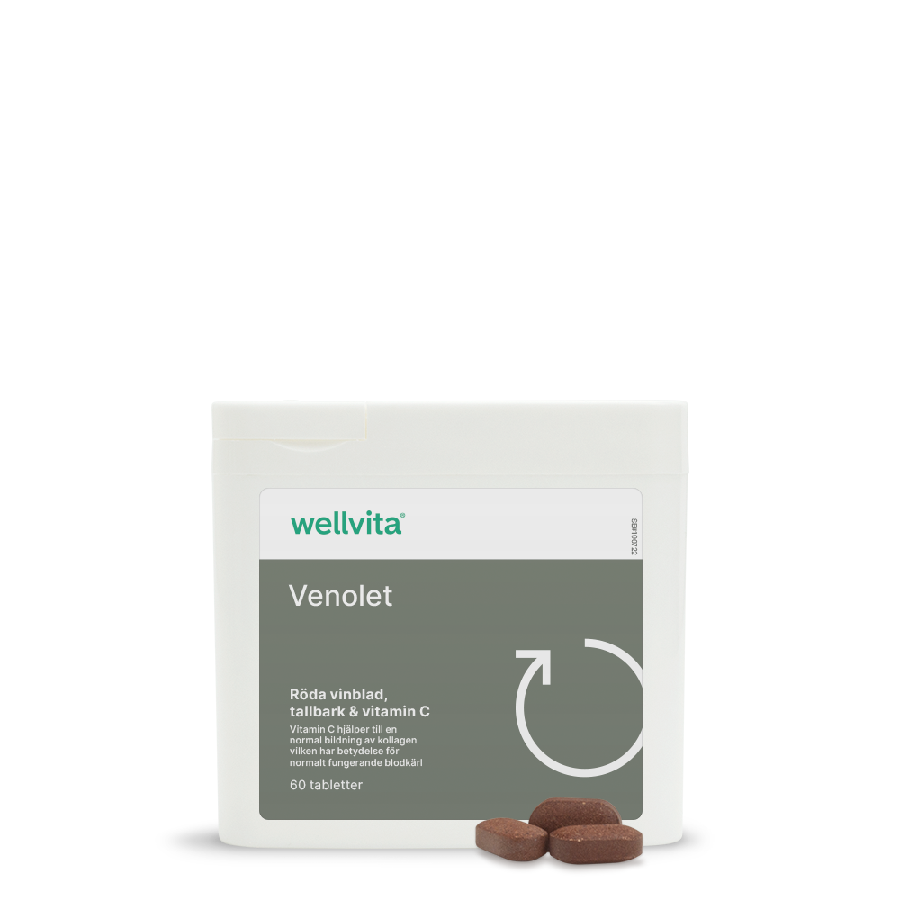 Dessutom kan du faktiskt också ge dina ömtåliga vener effektiv hjälp inifrån. En produkt som Venolet från Wellvita är ett växtbaserat extrakt som är bra för dina vener. De dagliga tabletterna kan hjälpa dig att få finare hy, mindre celluliter och minska känslan av trötta och tunga ben.
